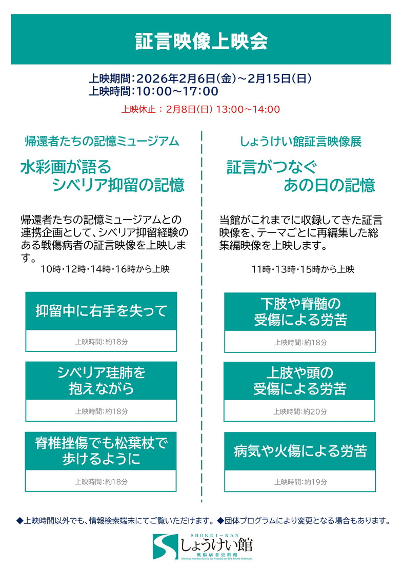 帰還者たちの記憶ミュージアムが九段生涯学習館で開催する特別展「水彩画が語る シベリア抑留の記憶」との連携企画として、シベリア抑留経験のある戦傷病者の証言映像を上映します。当館で開催中の証言映像展 「証言がつなぐあの日の記憶」に関連する上映とあわせて是非ご覧ください。