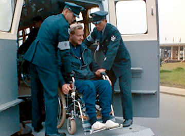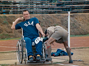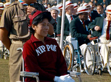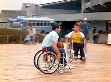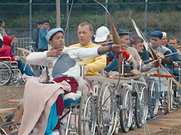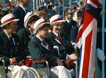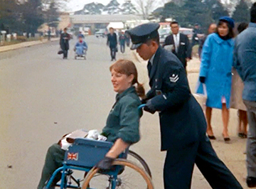 映画の槍投、砲丸投などの投てき競技において、選手たちの車椅子の後ろで車輪をしっかりと押さえているボーイスカウトが映っています。当時は車椅子を固定する装置が無かったため、このように介添え者が固定していたのです。