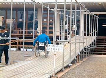 会場周辺の様子では、車椅子のまま車内に入れるリフト付きバスや、選手たちが利用する食堂に設置したスロープなどが記録されています。